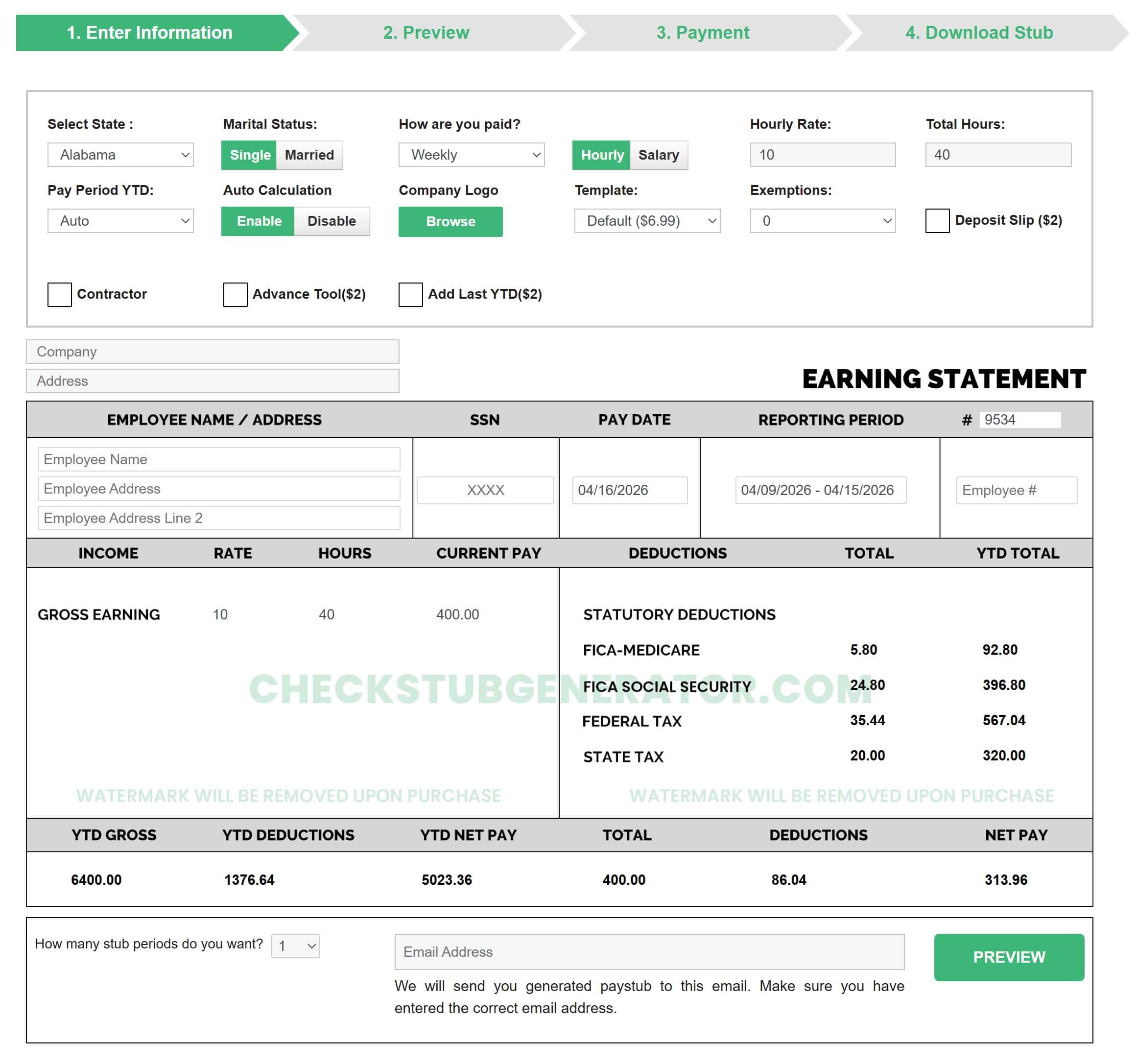 Once the paystub calculation part is done, you can access a preview of the paycheck you’ll be receiving via email. This is a crucial step for anyone willing to create a paystub template. Make sure to: